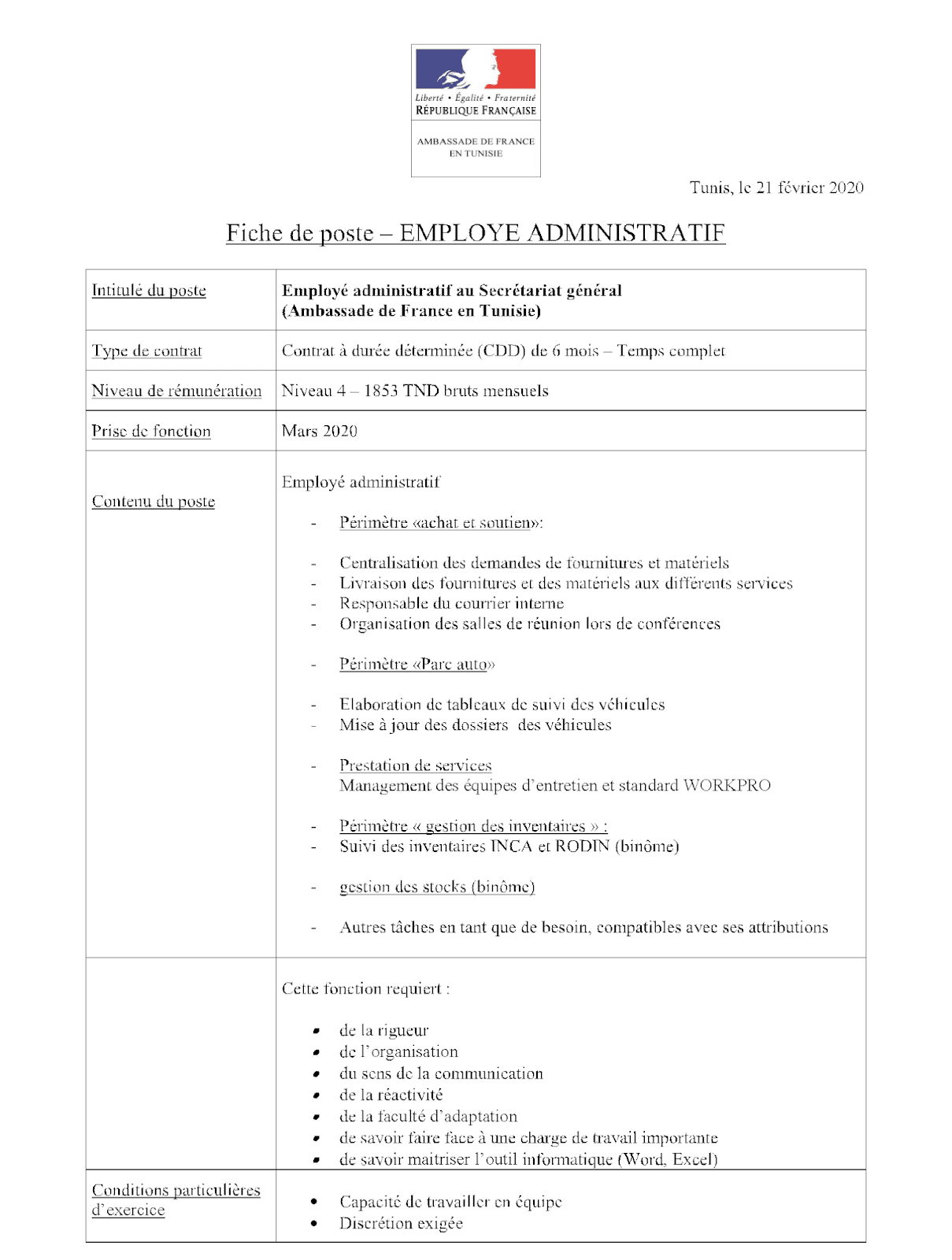 سفارة فرنسا بتونس تنتدب إطار إداري أخر أجل 28 فيفري 2020