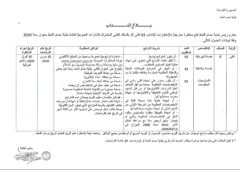 5edma بلدية حمام الشط تفتح مناظرة خارجية للإنتداب 5edma tunisie travail mars 2, 2020 بلدية حمام الشط تنتدب أعوان Post Views: 4 924