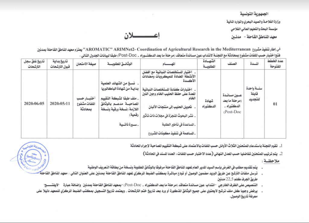 Dans le cadre du projet « AROMATIC » (ARIMNet 2-Coordination of Agricultural Research in the Mediterranean), l’Institut des Régions Arides de Médenine annonce l’ouverture d’un appel à candidature pour le recrutement d’un Assistant contractuel – Post-Doc.