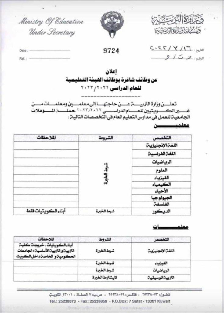 يرجى التقدم من خلال موقع وزارة التعليم بالكويت علي الرابط التالي من هنا .