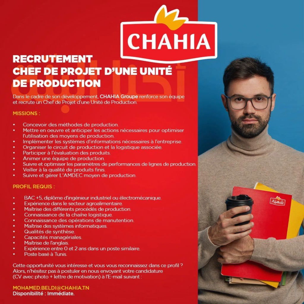Annonce recrutement : Chef projet d’une unité de production Zone Tunis