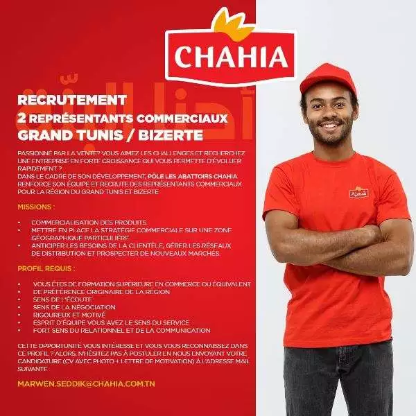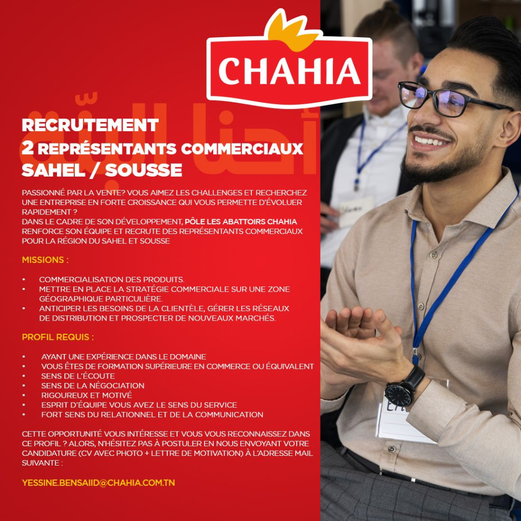 Dans le cadre de son développement, pôle les Abattoirs CHAHIA renforce son équipe et recrute des représentants commerciaux pour la région du Sahel et Sousse.