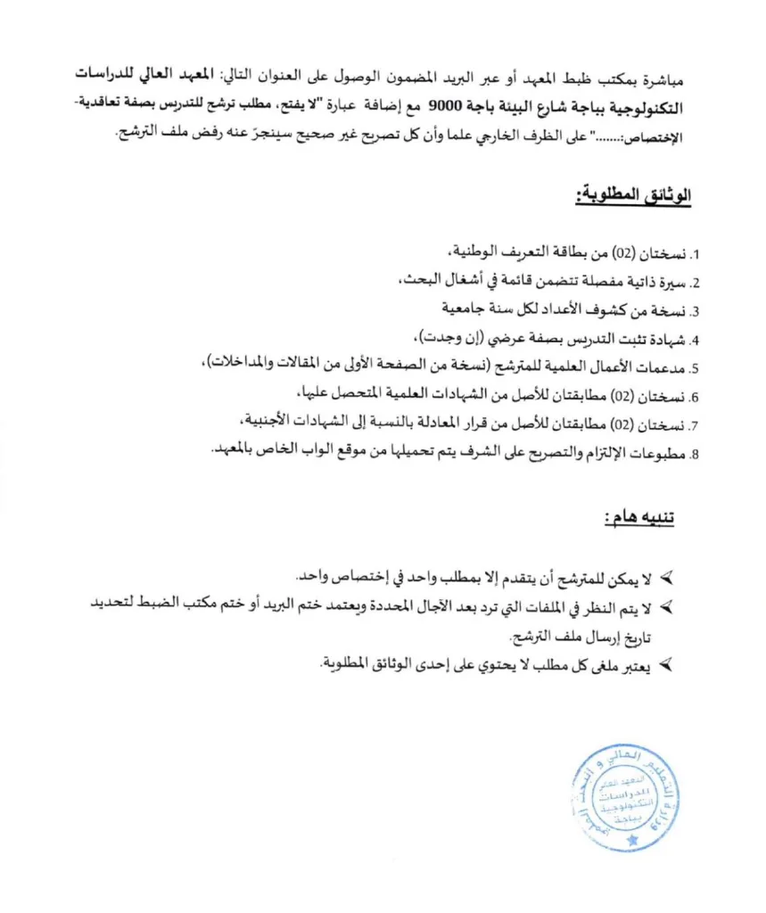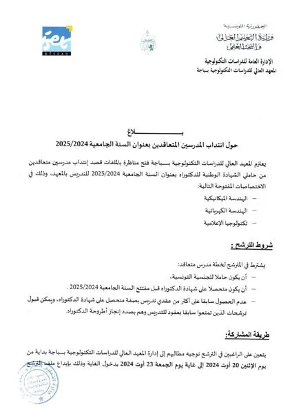 يعتزم المعهد العالي للدراسات التكنولوجية بـــــــــــــــــــــباجة فتح مناظرة بالملفات قصد إنتداب مدرسين متعاقدين من حاملي الشهادة الوطنية للدكتوراه بعنوان السنة الجامعية 2024/2025 للتدريس بالمعهد، وذلك في الاختصاصات المفتوحة التالية: